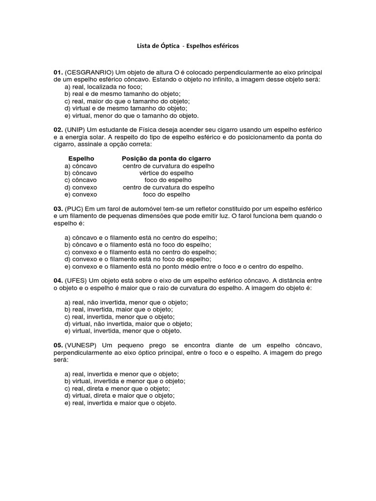 Lista de Óptica - Espelhos Esféricos | Espelho | Ótica