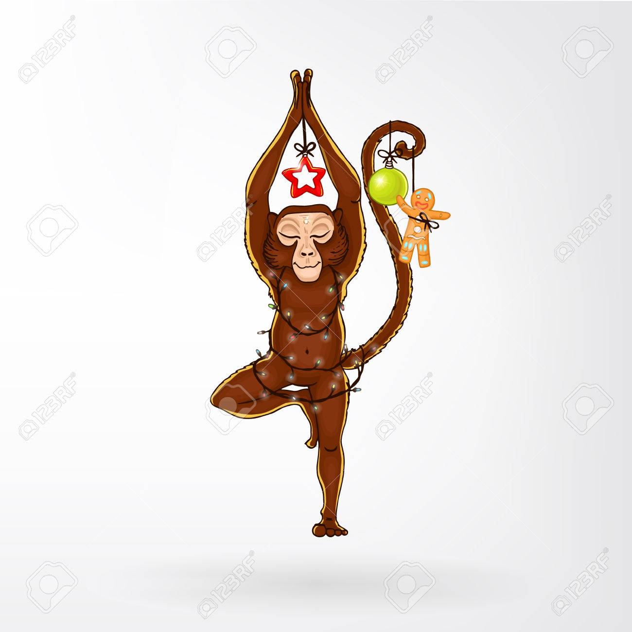 Mono Haciendo Yoga. Vrikshasana - Pose De árbol. Año Nuevo. Decoraciones De Navidad (aislado). La Imagen Se Puede Utilizar Para Su Negocio Como Un Anuncio En Estudios De Yoga, Dando Forma, Los
